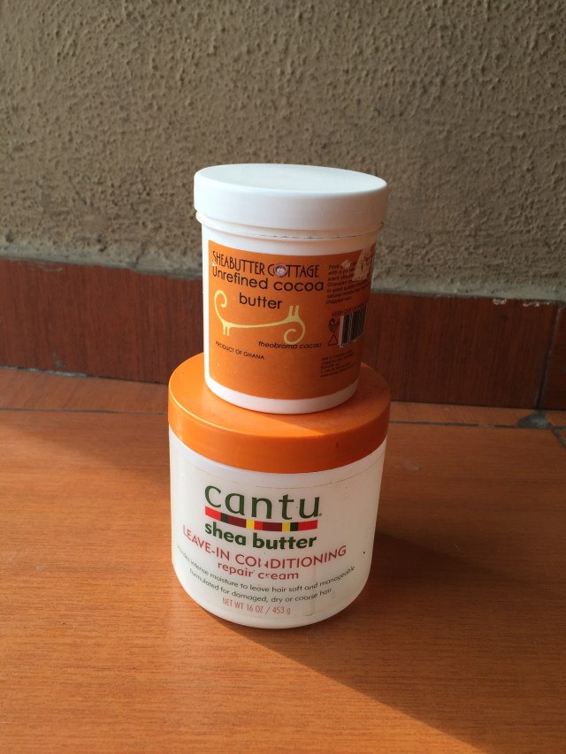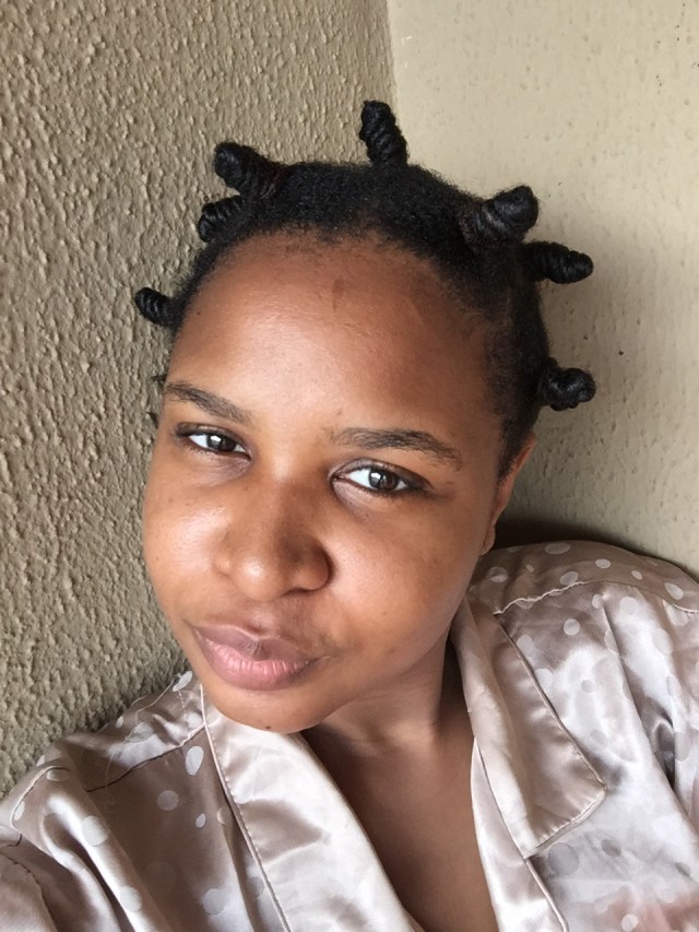 When it’s damp, I proceed to loosen a twist, apply Cantu and follow it up with cocoa butter(or Shea butter) focusing on my ends and then put it in a loose Bantu knot or flat twist so I can differentiate it from those I haven’t moisturized. I do this till I’m done with everything. I then loosen each Bantu knot or flat twist and put in back in a regular twist so I can have a twist out the next day. (Alternatively, I do a firm Bantu knot/flat twist after moisturizing each section so that I don’t have to loosen it after moisturizing).