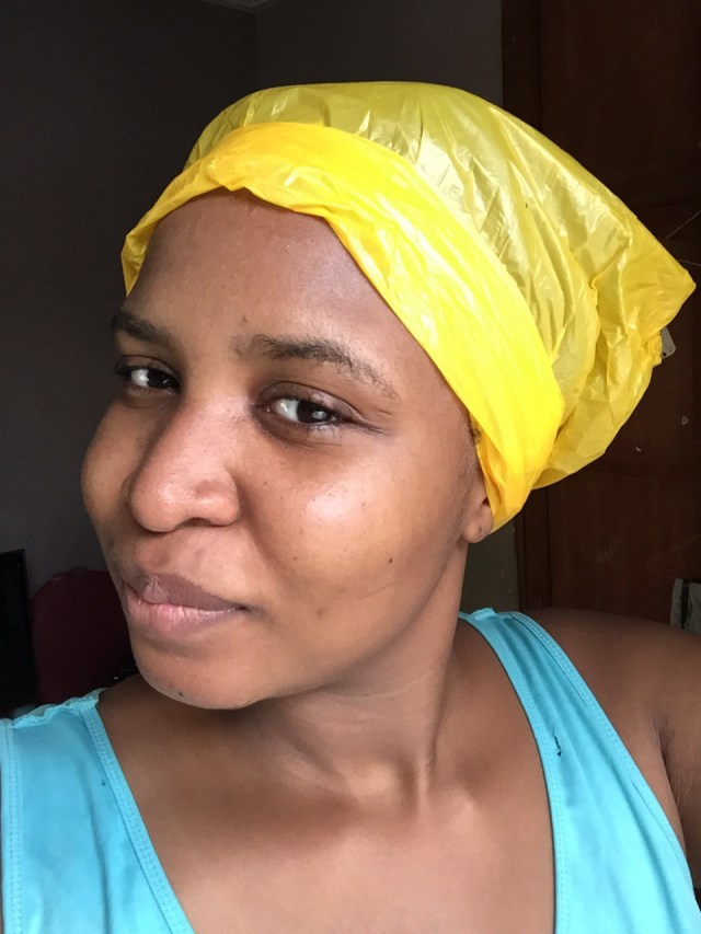 I usually sit around and wait till my hair is damp before I deep condition (but that’s because most times, I don’t use a towel/t-shirt to blot excess water so I have to sit and drip till the hair becomes damp. If I have a towel/t-shirt, I blot out the excess water after shampooing and proceed to deep condition). I apply my deep conditioner of choice that day, put on my shower cap a.k.a nylon bag and go about my business for the next hour or more. Then I rinse it out.