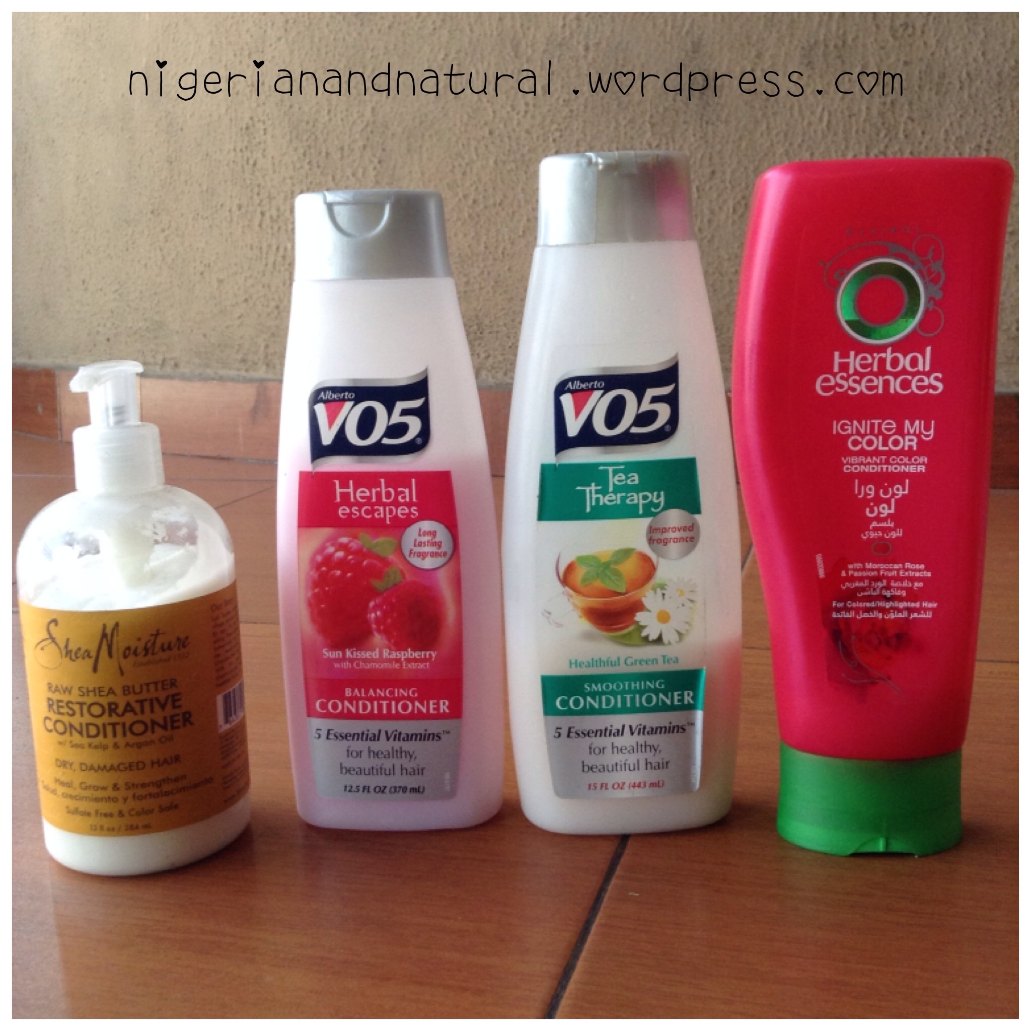 -V05 herbal escapes conditioner (purchased at NITC but can be bought at many local grocery/beauty stores. I mostly buy it at Bruno's Place opposite Silverbird at Ikeja City Mall)