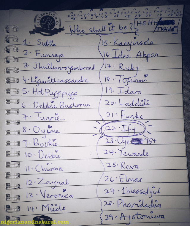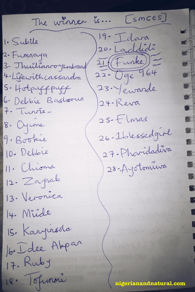 Another random selection (after removing Ify’s name) and Funke won!!