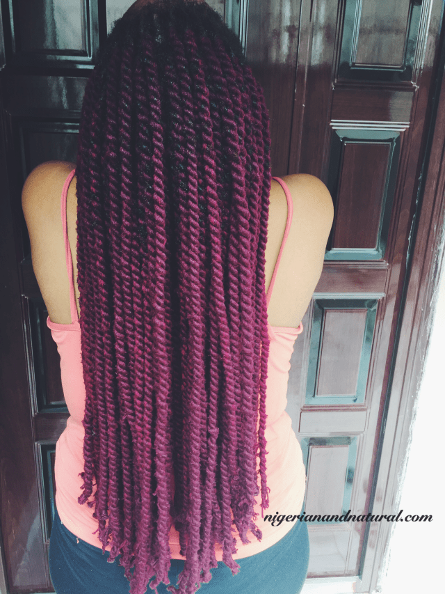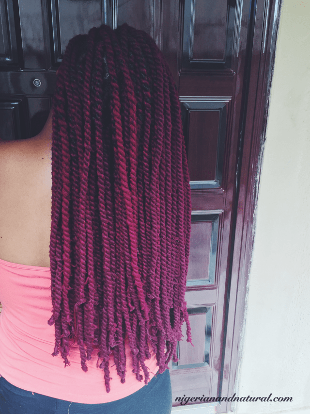 These are twists done with about 16 packs of wool/yarn and I’ve had them for a little over 5 weeks now.