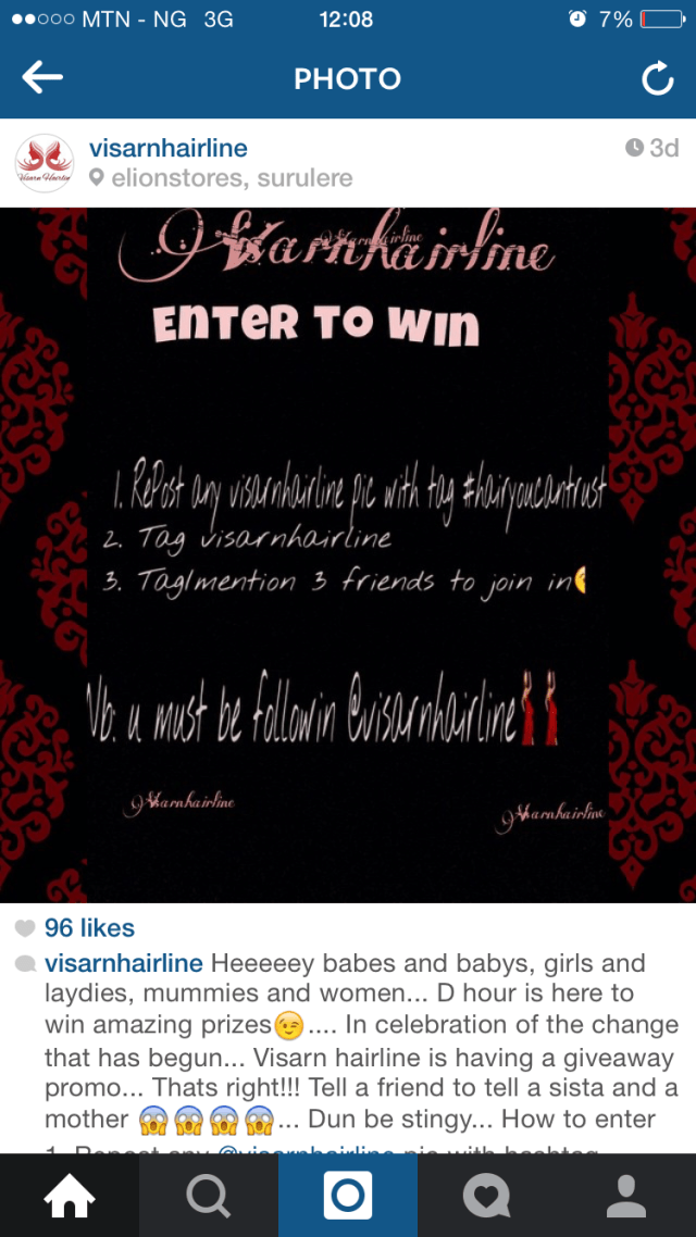 Visarn Hair Line, a company that sells human hair is having a giveaway which is open to entries nationwide in Nigeria and ends on the 4th of June.